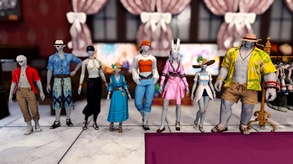 Seraphina: "None of it dyed, it's all default colours. Having said that, I do like the fact that she's gone in a completely different direction. Rather than just a fashion show, she's going with 'what would an Eorzean person actually wear during their working day in spring'. So I like that."